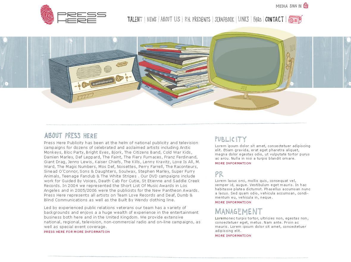 Press Here is a publicity agency representing many of the leading rock artists. The project initially featured a largely private press resource section with minimal public information. In lieu of much public content, the goal was to establish a fun brand presence and allow for private access upon request. The homepage featured an animated piece with a variety of hands poking in to press the button of the TV box in the center. Ultimately, the site was not fully realized.